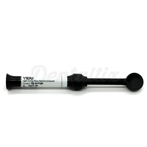 Composite universal nanohíbrido y fotopolimerizable de la marca VIDU. Es altamente estético y está indicado para numerosas restauraciones.