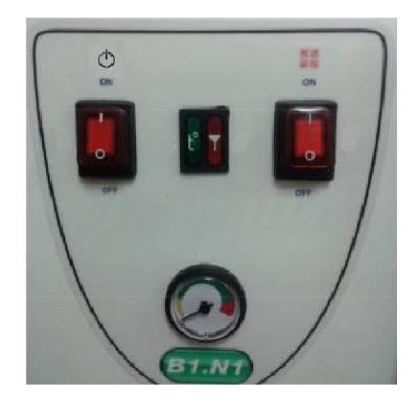 - Painel de controlo: com botão ON e OFF, botão para aplicar o desinfectante e outro para o desligar. Tem também um sinal luminoso que indica quando a máquina está pronta para ser utilizada. O manómetro de pressão indica o grau de pressão do vapor.
